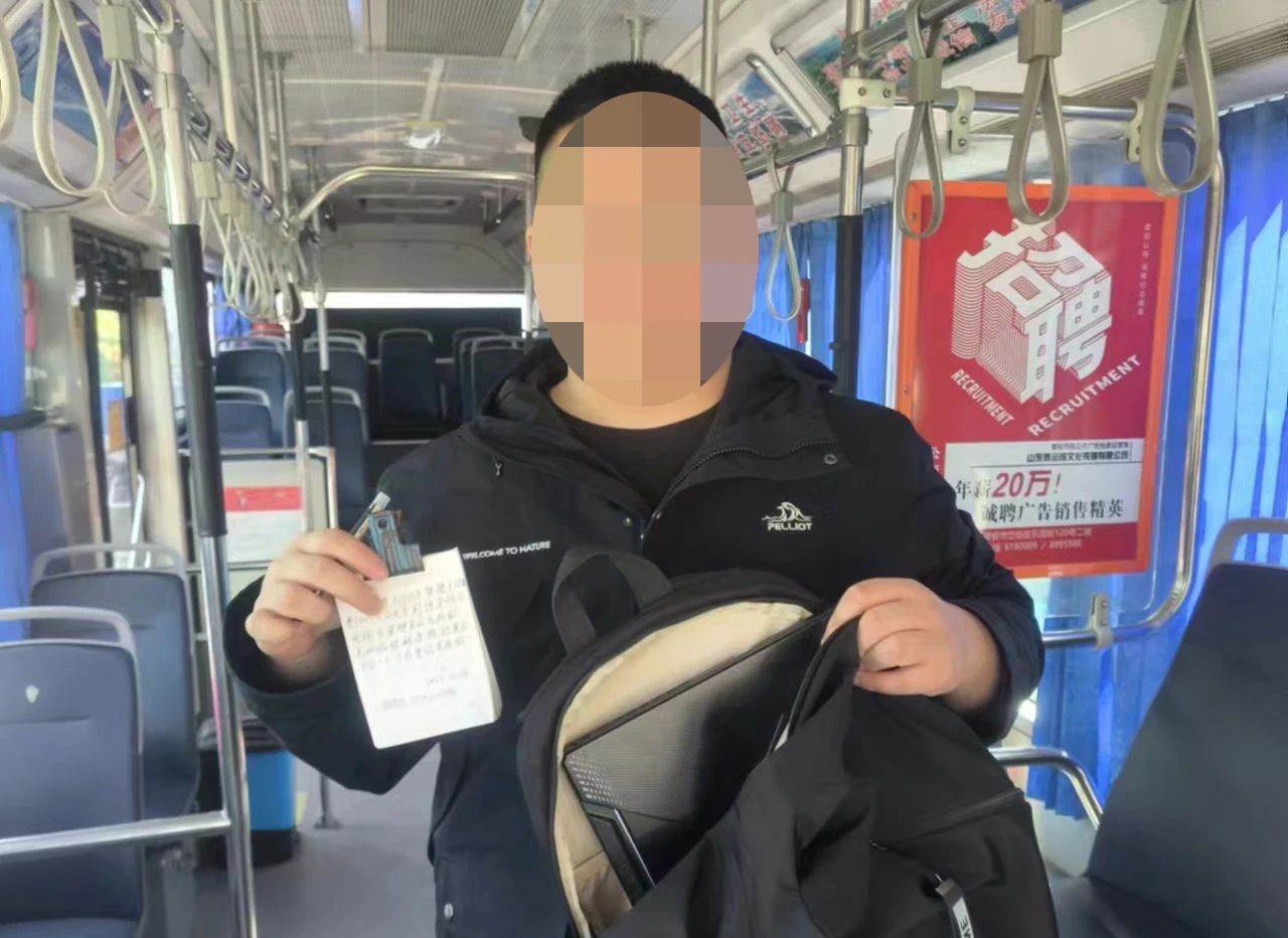 當(dāng)日13時(shí)18分,姜文文駕駛魯J03915D公交車抵達(dá)高新區(qū)水泉停車場(chǎng)。完成運(yùn)營(yíng)任務(wù)后,他按照日常規(guī)范對(duì)車廂進(jìn)行檢查清掃,在駕駛員座椅后方發(fā)現(xiàn)一個(gè)黑色雙肩包。經(jīng)清點(diǎn),包內(nèi)裝有戴爾筆記本電腦、身份證、錢包等重要物品??紤]到失主的焦急心情,姜文文第一時(shí)間通過(guò)微信工作群向分公司匯報(bào)情況,并留在車輛旁等候。