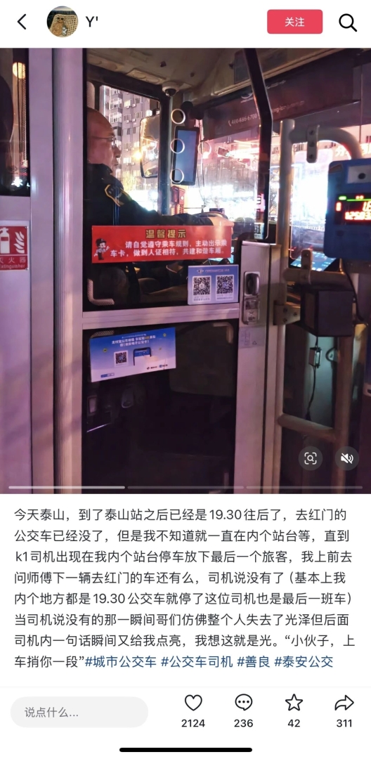 近日,泰安公交1路駕駛員律發(fā)彬的暖心事跡在網(wǎng)絡(luò)上引發(fā)熱烈反響,眾多網(wǎng)友紛紛點(diǎn)贊留言,稱贊“泰安太暖心了!”。這一切源于3月25日晚一場(chǎng)觸動(dòng)人心的美好相遇。